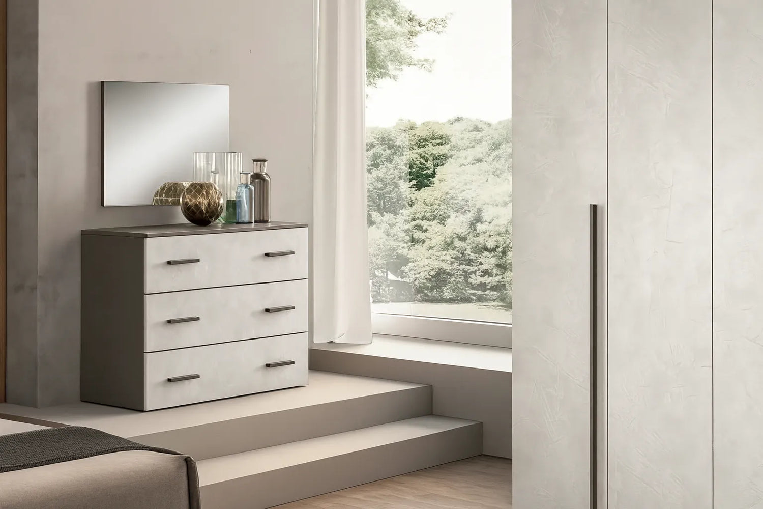 Realizzata in finitura cemento, questa composizione combina eleganza contemporanea e funzionalità, donando alla zona notte un’atmosfera essenziale, accogliente e sofisticata.