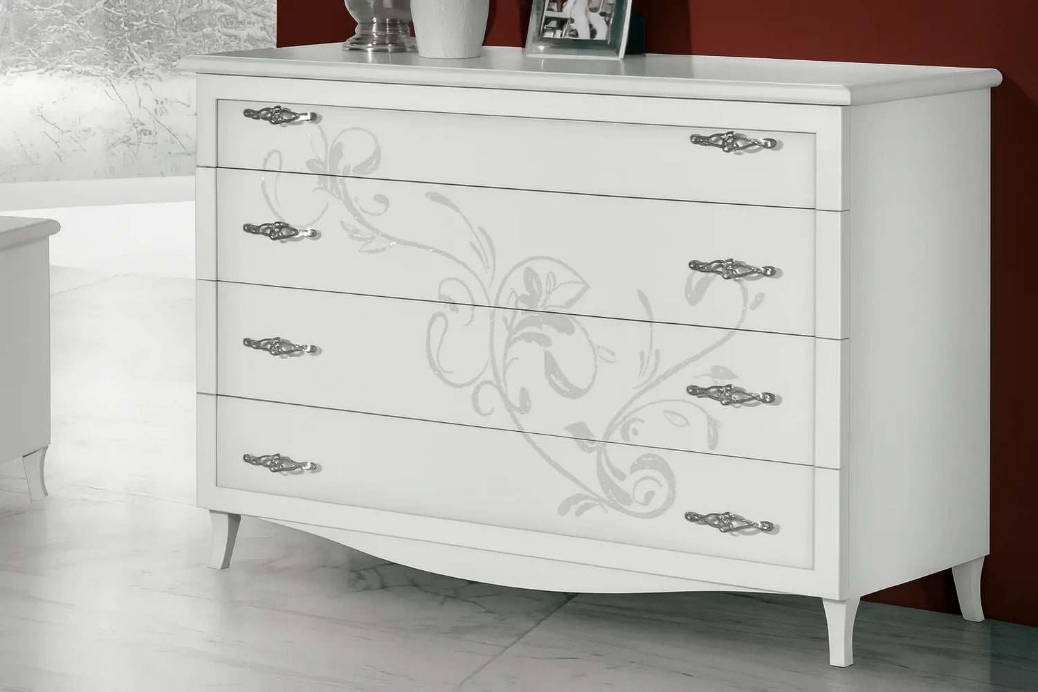 Comò e comodini, finemente lavorati con serigrafie argento e maniglie gioiello, completano la composizione, mentre la specchiera abbinata aggiunge un tocco finale di luce e raffinatezza.
