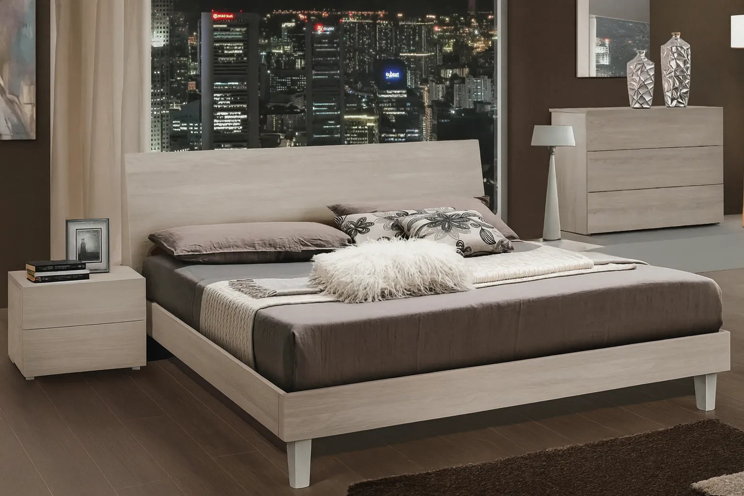 Il letto matrimoniale dal design lineare e minimalista si abbina perfettamente al resto della composizione, offrendo comfort e solidità. La struttura in finitura olmo si integra con la testiera dallo stile moderno, donando equilibrio e calore visivo all’ambiente.