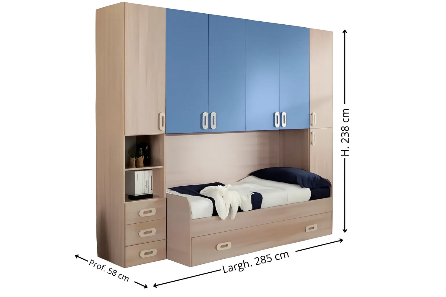 La struttura in olmo si abbina ai frontali azzurri, creando un contrasto elegante e vivace, ideale per camere giovani e luminose.