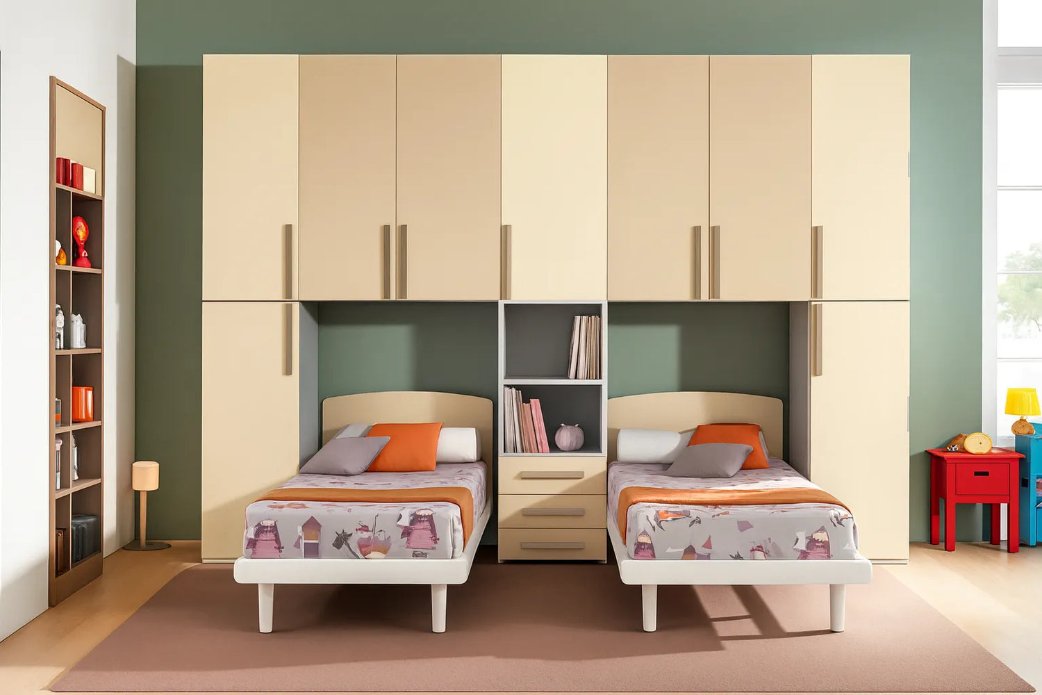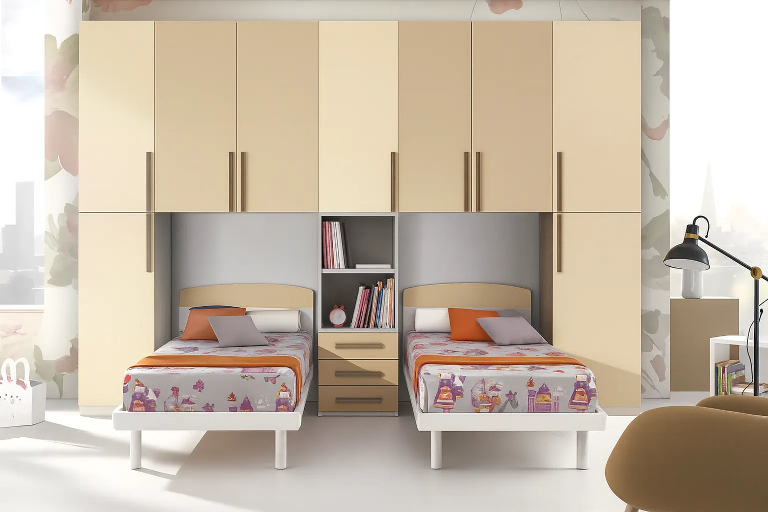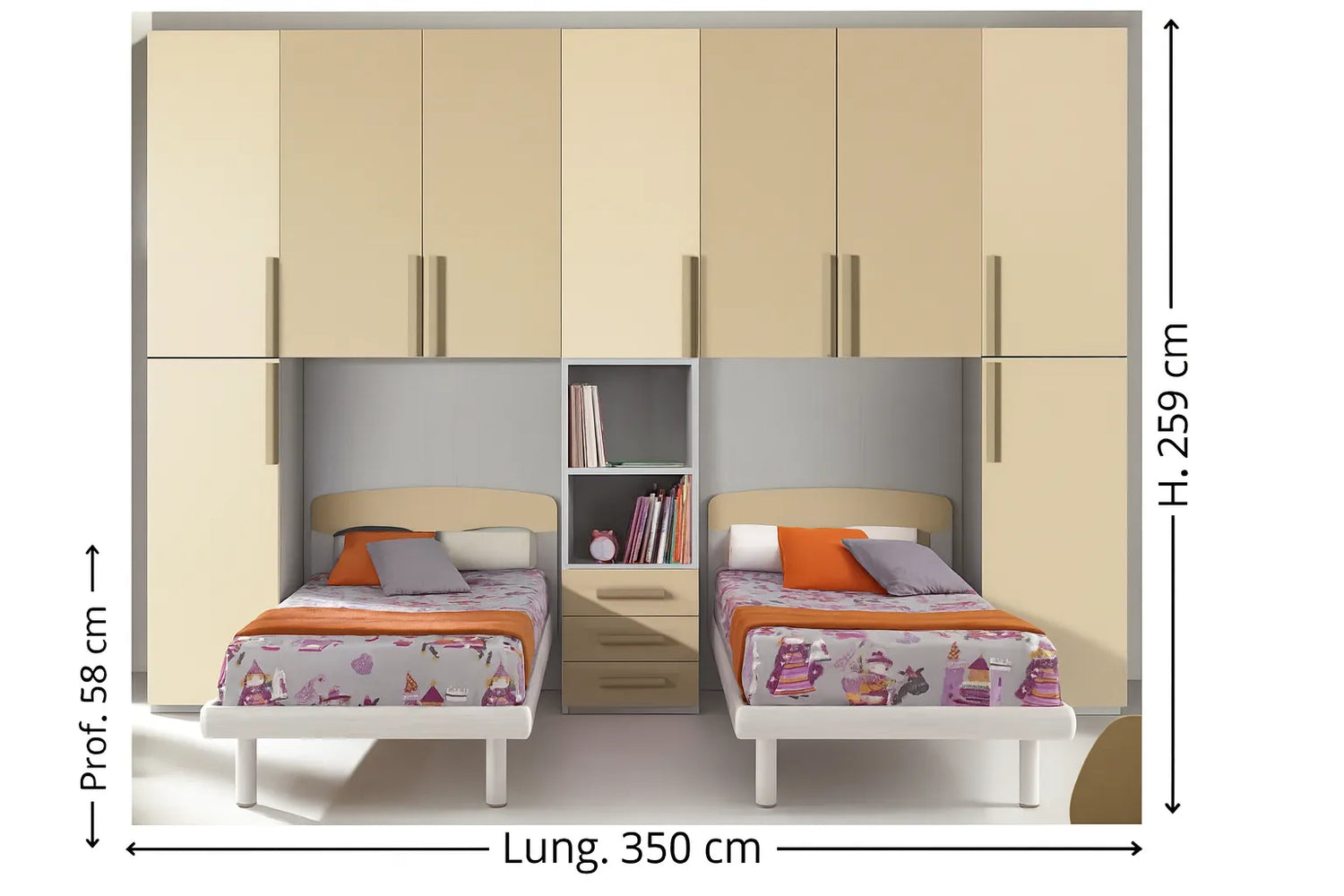 Il doppio letto singolo, separato da una colonna centrale con cassetti e libreria integrata, garantisce massima funzionalità e comfort, perfetta per due ragazzi o come soluzione per gli ospiti.