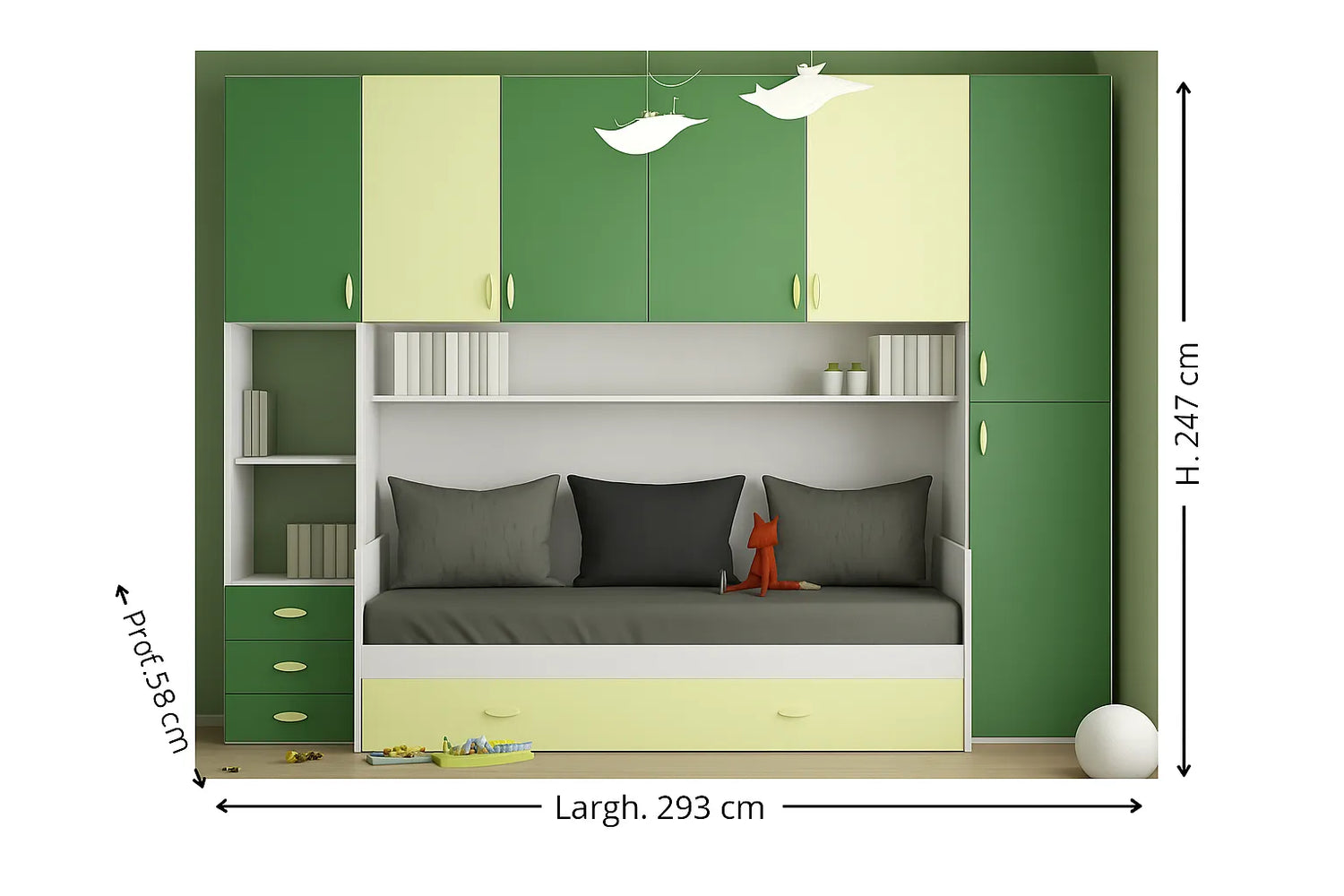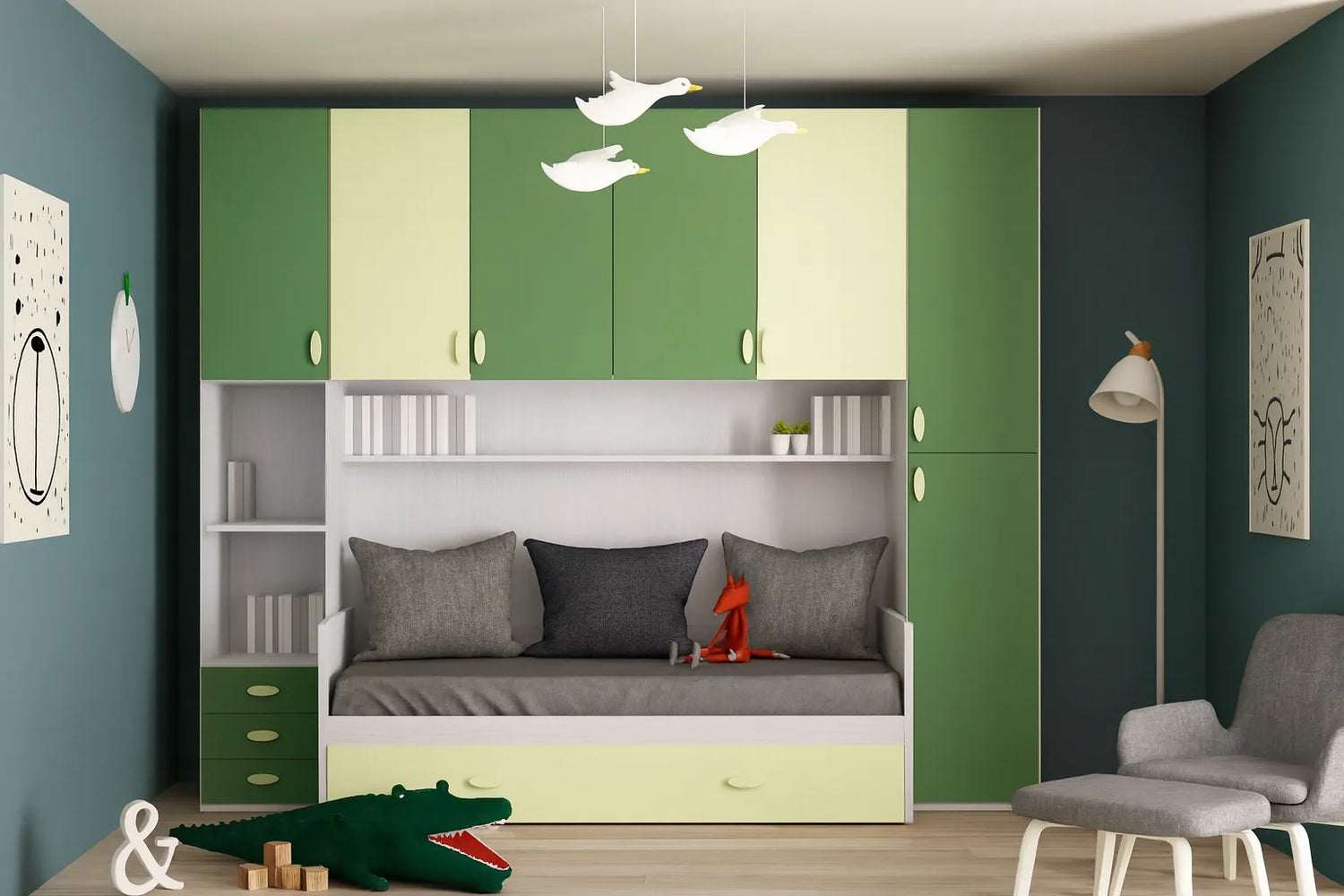 La composizione a ponte consente di ottimizzare lo spazio, offrendo ampie soluzioni contenitive per vestiti, libri e giochi.