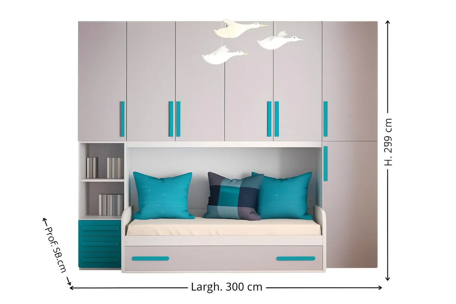 Il design a ponte consente di sfruttare al massimo ogni centimetro, offrendo ampi vani contenitore, colonne laterali e mensole integrate per riporre vestiti, libri o giochi.