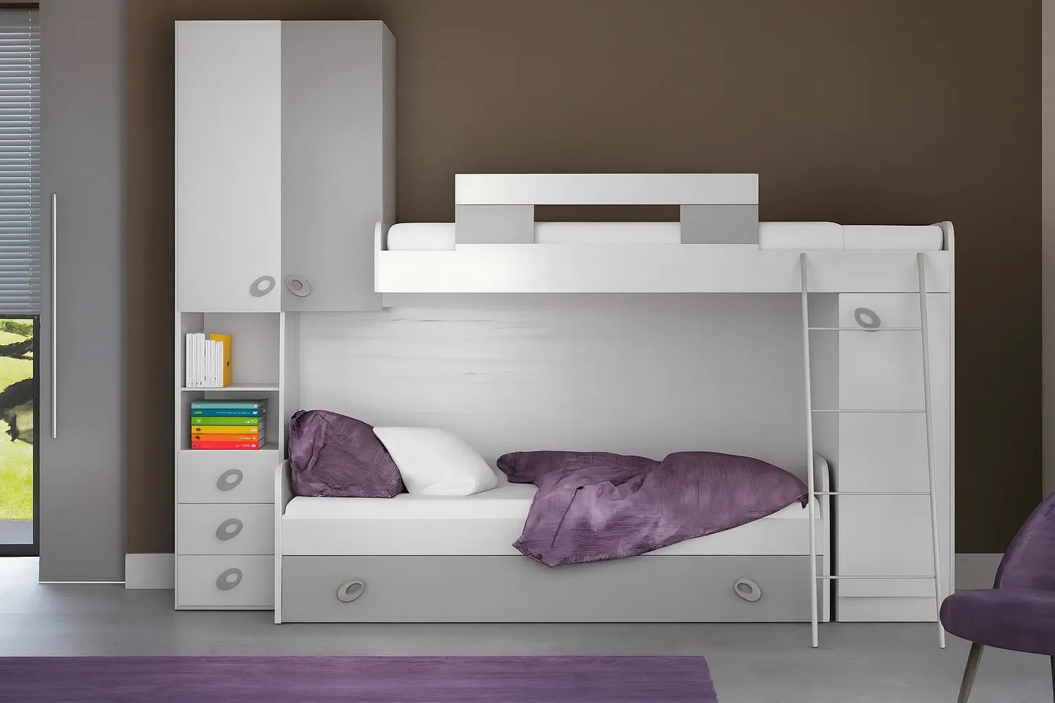 Realizzata con struttura bianco frassinato e frontali bianco frassinato e grigio, unisce eleganza e praticità in un’unica soluzione, ideale per bambini e ragazzi.