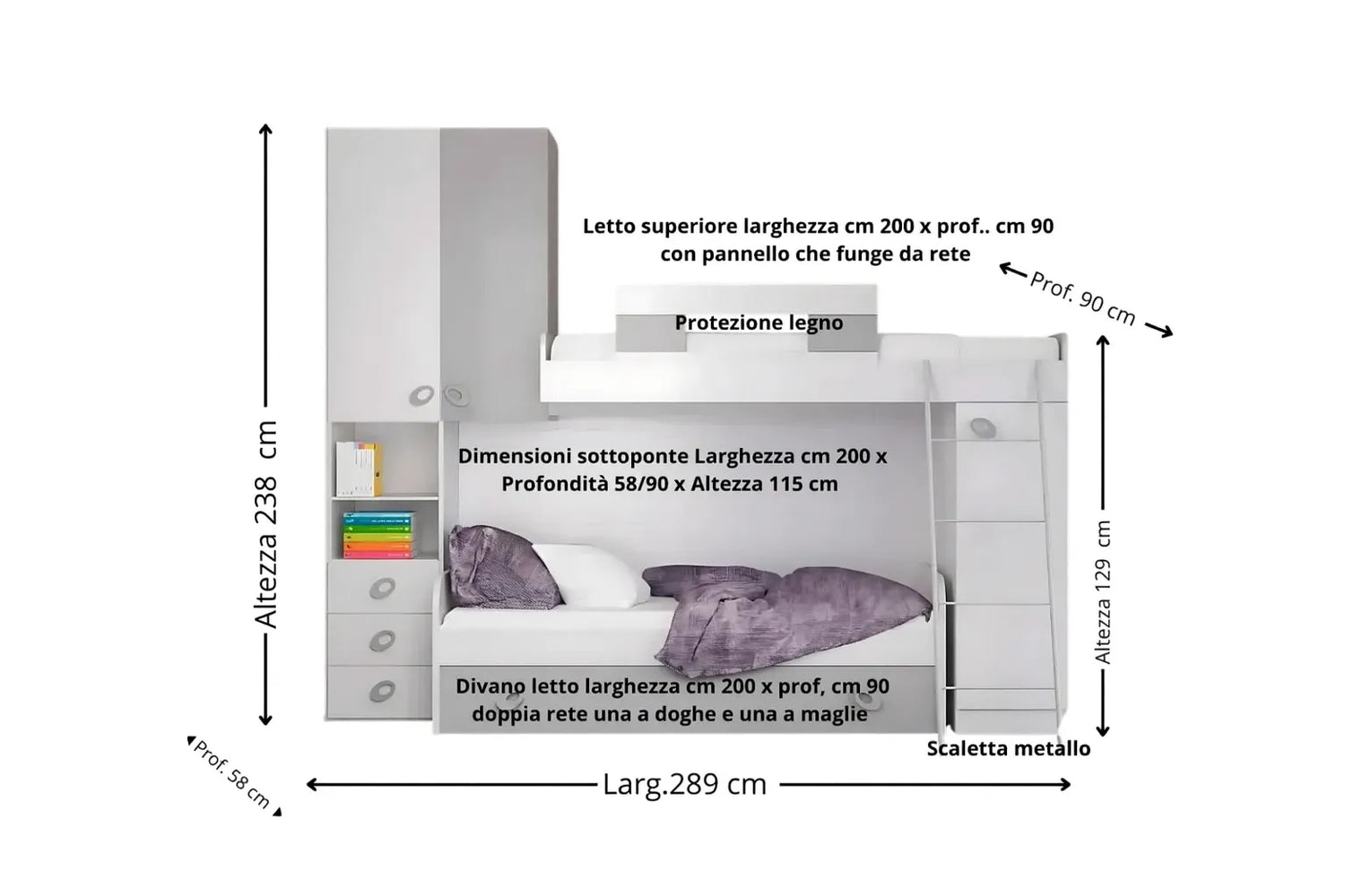 Grazie alla struttura a soppalco, sfrutta al meglio lo spazio verticale, offrendo ampi contenitori e una perfetta organizzazione quotidiana.