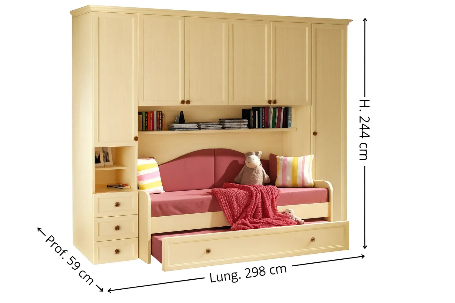 Il letto con doppia rete a doghe offre massima comodità e la possibilità di ospitare un secondo letto estraibile, perfetto per la cameretta dei ragazzi o per la stanza degli ospiti.