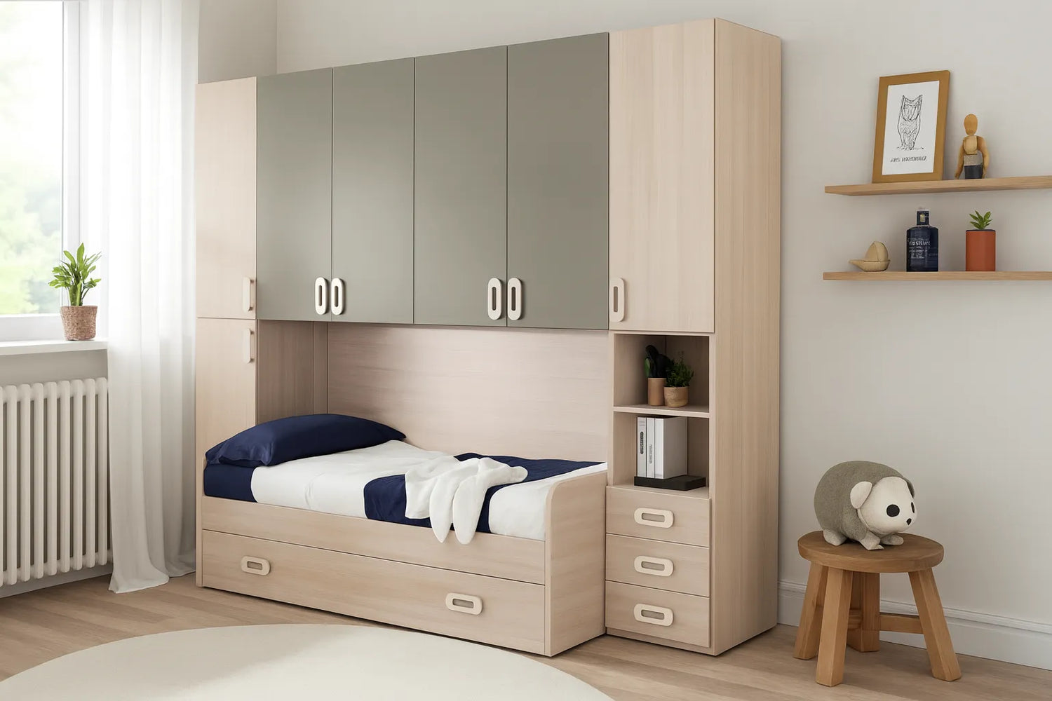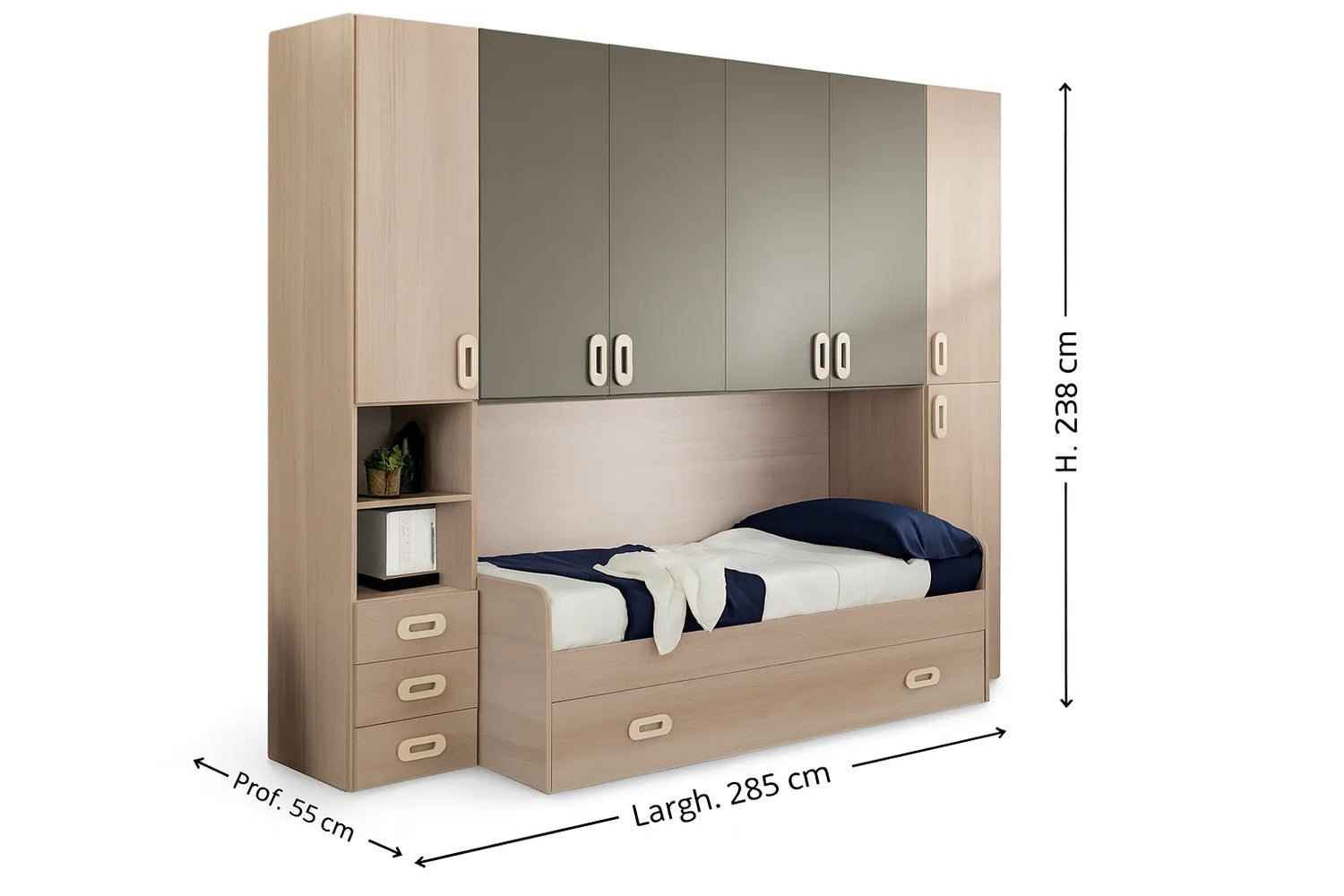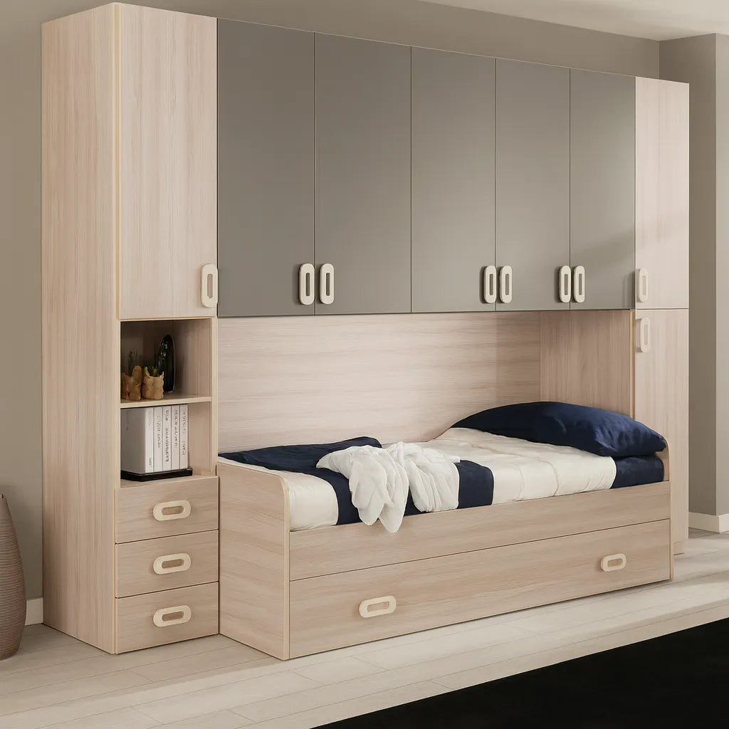 La composizione a ponte consente di ottimizzare lo spazio, con armadi capienti, librerie integrate e una doppia rete a doghe che garantisce comfort e versatilità.