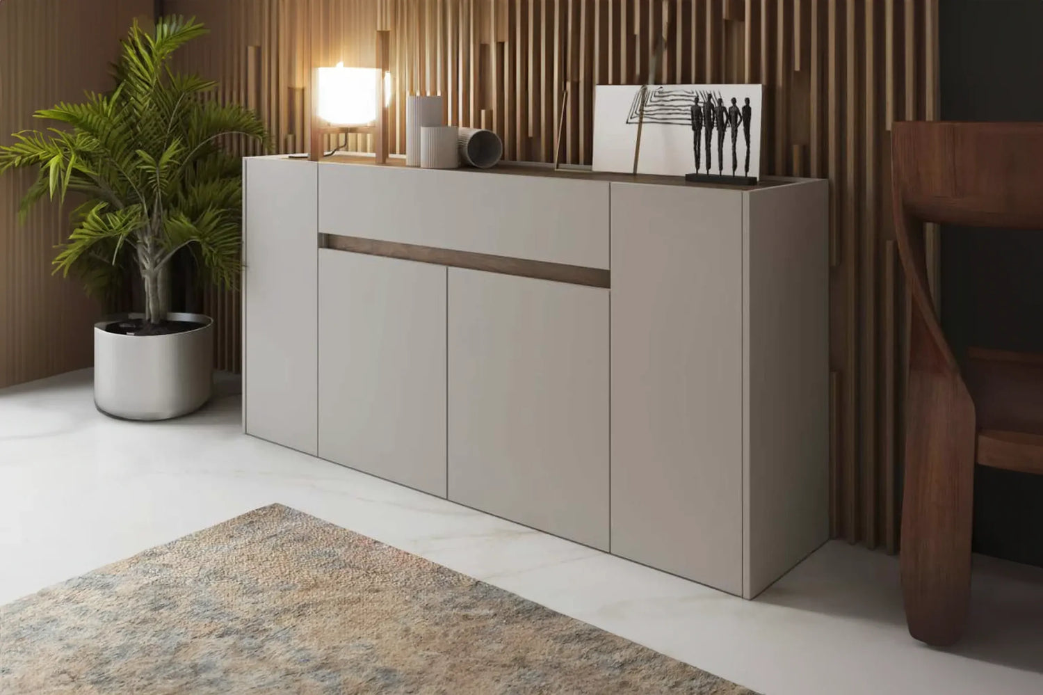 La combinazione delle finiture Cachemire e Mercure crea un effetto caldo, elegante e contemporaneo, ideale per chi cerca un mobile dal design attuale e curato nei dettagli.