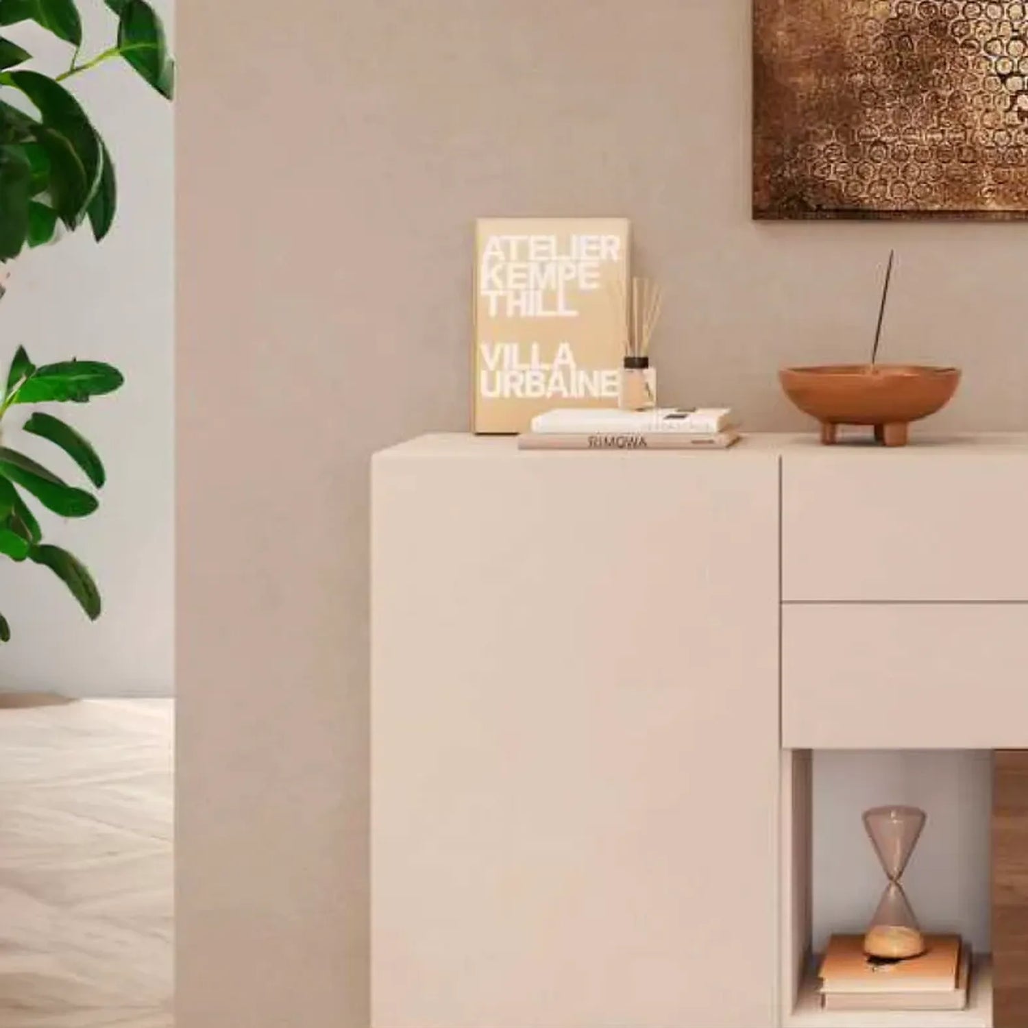 La combinazione delle finiture Cachemire e Mercure crea un equilibrio raffinato e caldo, perfetto per completare la zona living con stile.