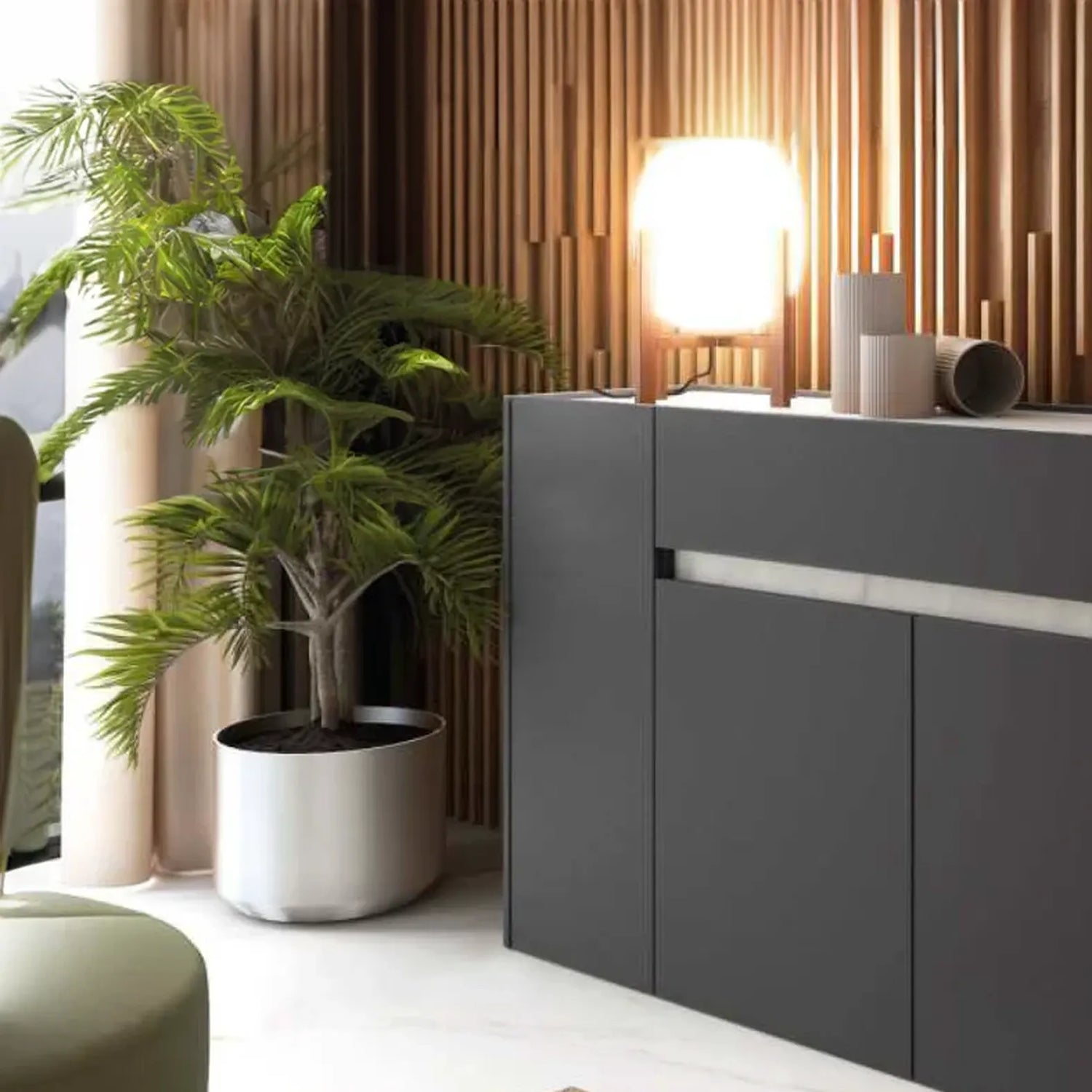 La finitura Grafite si unisce alla fascia in Marmo creando un contrasto raffinato e contemporaneo, ideale per arricchire l’ambiente senza appesantirlo.