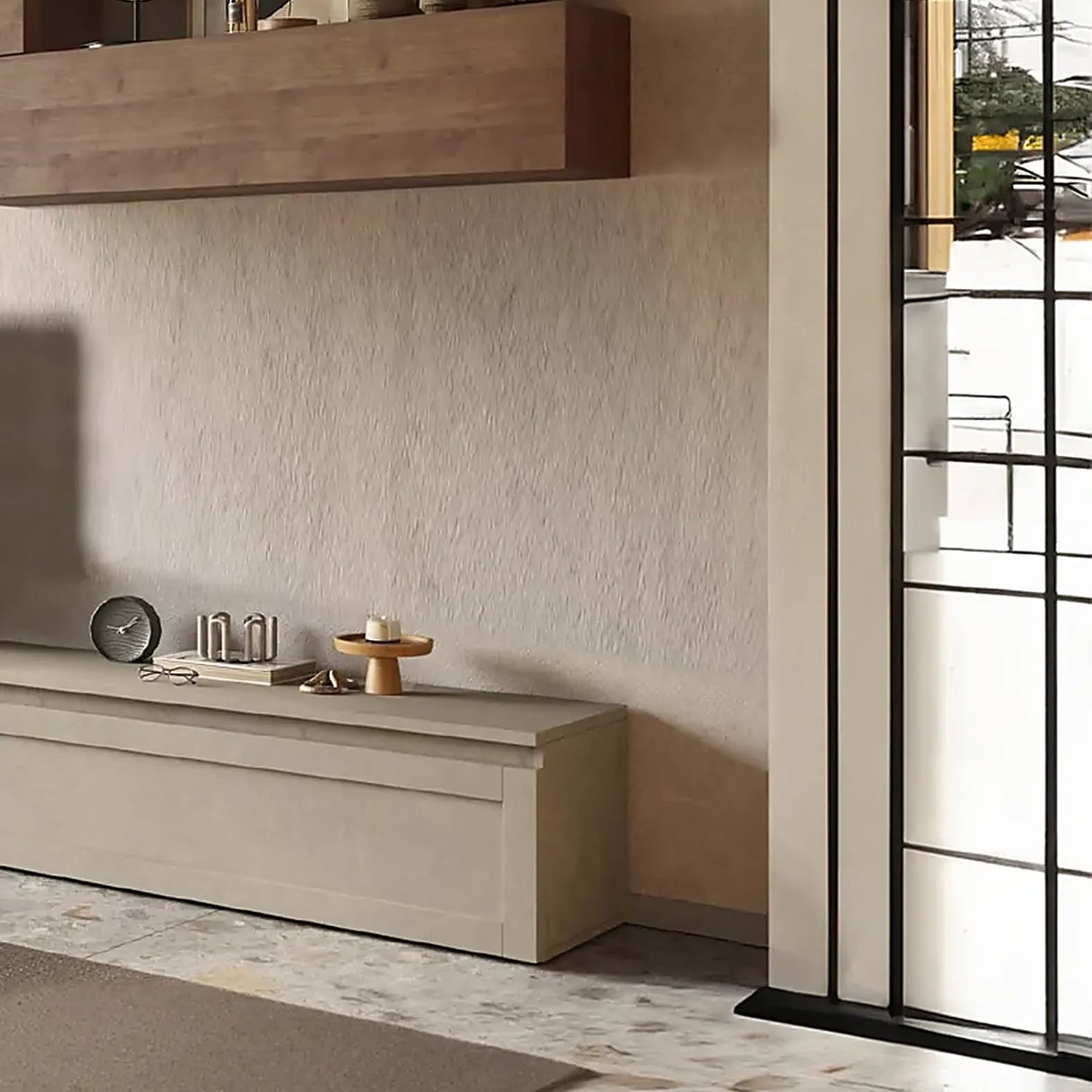 La finitura Argilla unita alla tonalità Mercure crea un equilibrio caldo ed elegante, perfetto per ambienti contemporanei e luminosi.