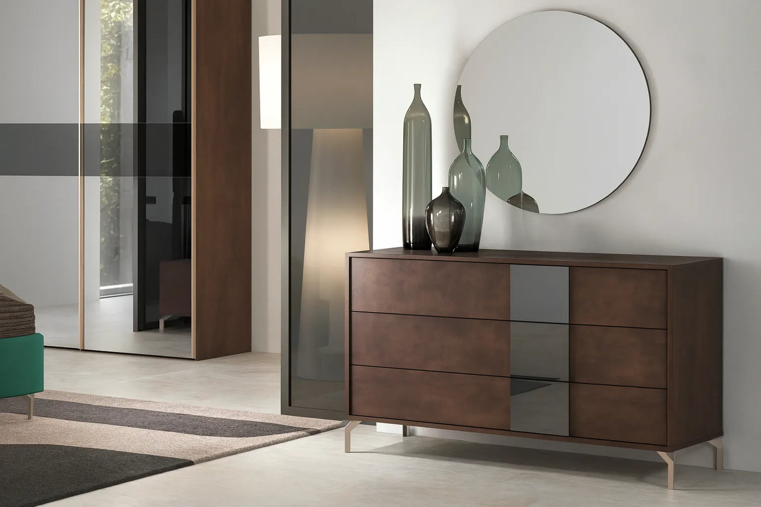 Il comò e i comodini coordinati riprendono la stessa finitura effetto pelle bronzo, con frontali dal design geometrico, profili e piedini color champagne, che aggiungono un tocco di eleganza contemporanea.
