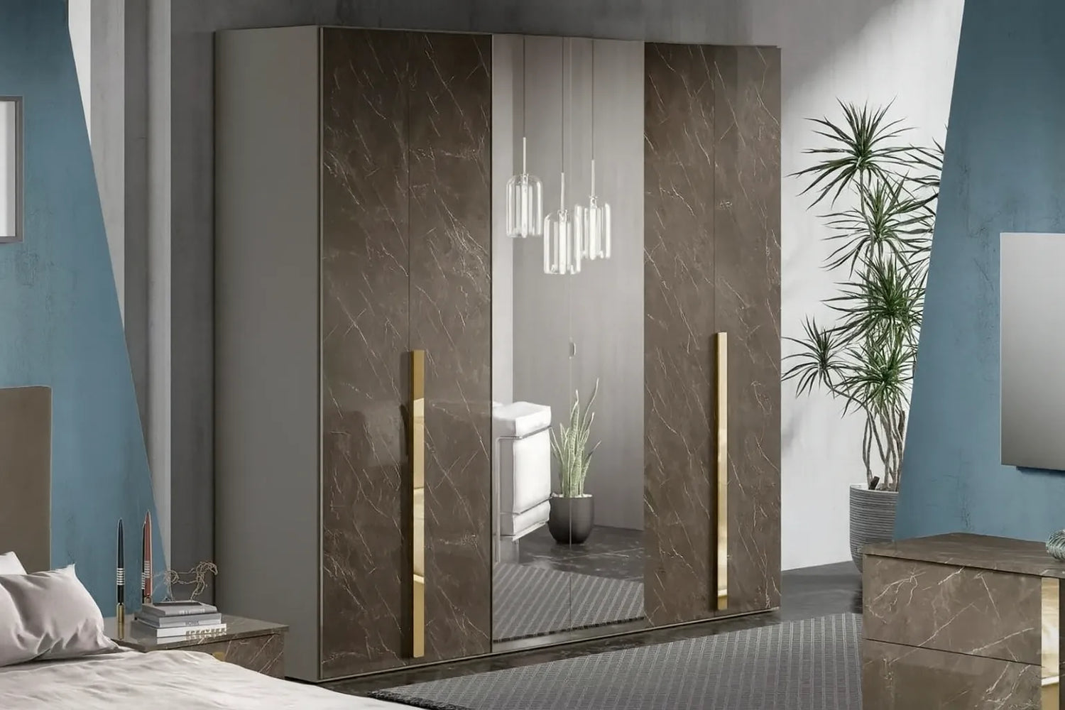 L’armadio battente con maniglie oro verticali conferisce eleganza e verticalità alla composizione, con una finitura che riprende l’effetto marmo per un risultato di grande classe.