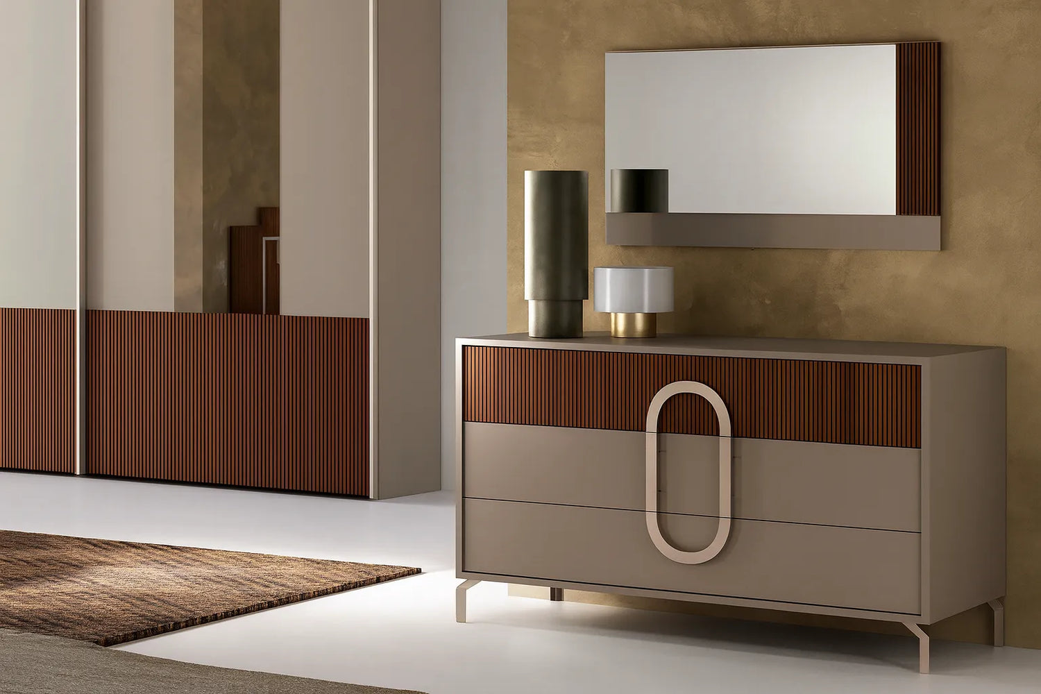 Il comò e i comodini coordinati, con maniglie decorative a forma ovale e piedini color champagne, aggiungono un tocco di stile e continuità estetica all’intera camera.