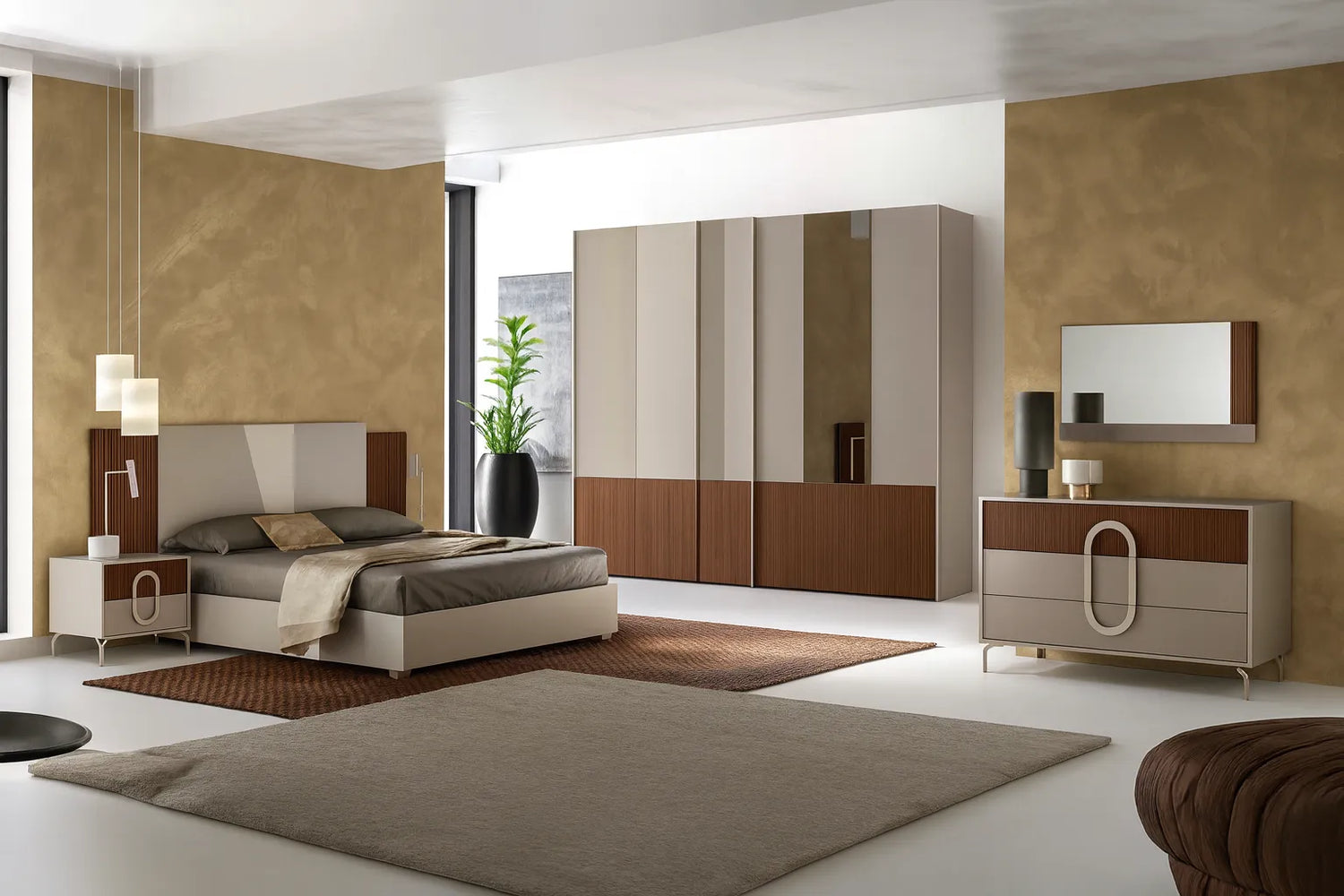 Camera da letto Napoli con letto contenitore – Design moderno tortora e noce cannettato